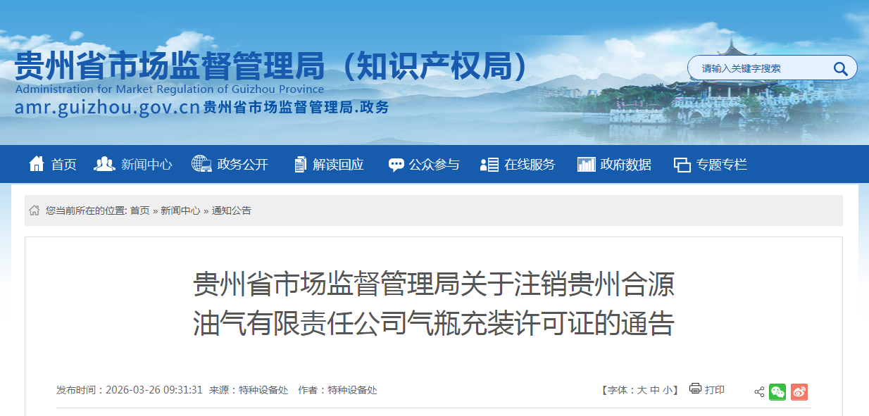 贵州省市场监督管理局关于注销贵州合源油气有限责任公司气瓶充装许可证的通告