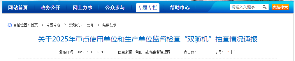 中国质量新闻网讯 据福建省莆田市市场监督管理局网站消息,近日,该局通报2025年重点使用单位和生产单位监督检查“双随机”抽查情况。