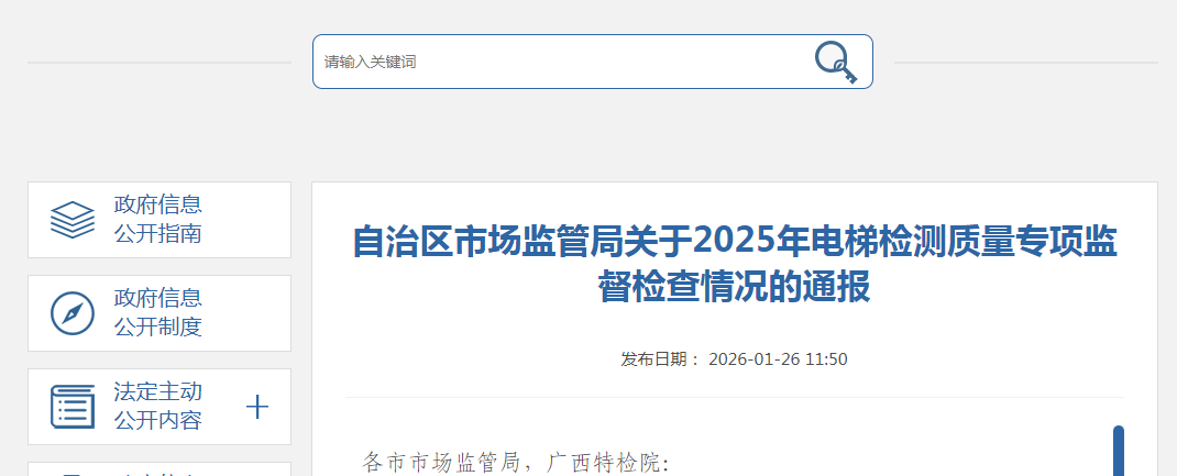12 | 江西壹方特种设备有限责任公司 (机构地址:江西省南昌市湾里梅岭森林国家公园旁新经济产业园11栋544室) | 1.未提供对使用单位落实总局第74令提出要求的见证材料; 2.未见检测质量监督检查见证资料,不符合《特种设备检测机构核准规则》(TSG Z7002-2022)D5.9的要求; 3.法律法规、技术规范未按公司体系要求进行管理,不符合《特种设备检测机构核准规则》(TSG Z7002-2022)D5.9(9)的要求; 4.未制定在广西开展业务人员和检测记录和报告签字人员的名册,不符合《特种设备检测机构核准规则》(TSG Z7002-2022)D4.1的要求; 5.报告编号JXYF-桂C-DTJC-2511561811的原始记录中A1.2.4.7“手动紧急操作装置”(3)“盘车轮”、(4)“盘车轮电气安全装置”填写为无此项,而电梯实物有盘车轮及电气安全装置,不符合《电梯自行检测规则》(TSG T7008-2023)A1.2.4.7(3)(4)项的要求; 6.A1.2.1.2“机房通道门及警示标志”检测项目中,机房门锁不符合要求(门锁住后不用钥匙不能够从机房内将门打开),但检测报告该项目检测结果为“符合”,不符合《电梯自行检测规则》(TSG T7008-2023)A1.2.1.2(1)项的要求; 7.A1.2.6.2“轿厢安全窗”检测项目中,电梯实物有轿厢安全窗及电气安全装置,但检测人员未检出,不符合《电梯自行检测规则》(TSG T7008-2023)A1.2.6.2项的要求; 8.A1.3.14项“噪声测试”检测项目中,进行噪声测试时,未测量背景噪声,不符合《电梯自行检测规则》(TSG T7008-2023)A1.3.14项的要求; 9.报告编号JXYF-桂C-DTJC-2511561811的原始记录中A1.2.4.7“手动紧急操作装置”(3)“盘车轮”、(4)“盘车轮电气安全装置”填写为无此项,而电梯实物有盘车轮及电气安全装置,不符合《电梯自行检测规则》(TSG T7008-2023)A1.2.4.7(3)(4)项的要求。 | 桂林市 |